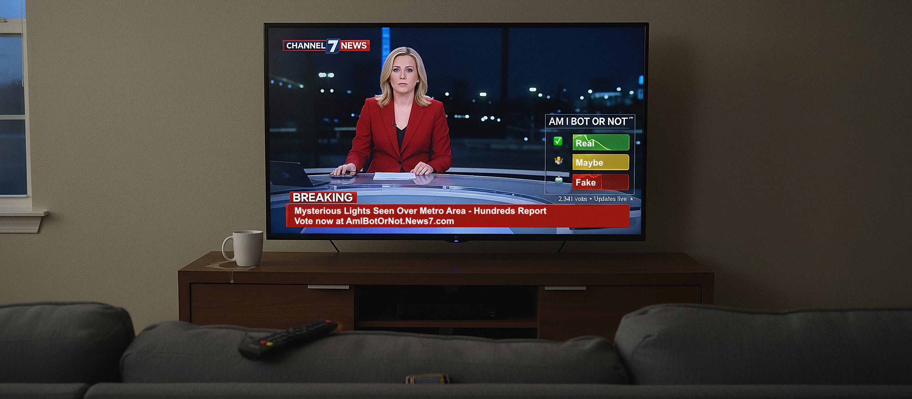 The anchor says “Vote now at am i bot or not dot blah blah” with the same enthusiasm people used to reserve for “film at eleven.” Like the vote is the story. Maybe it is.