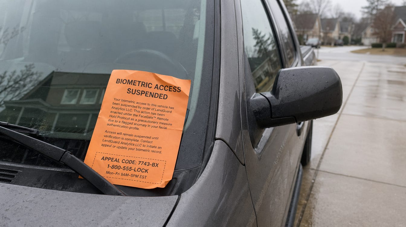 Routine, now, is how the escalation path runs. Missed payment → remote biometric lockout → physical repossession. No repo man required for step two. The truck handles it. The face recognition you agreed to in the dealer’s office becomes the mechanism that leaves you standing on your own driveway at 7am, looking at a vehicle that knows your face and has decided, on someone else’s instruction, to forget it.