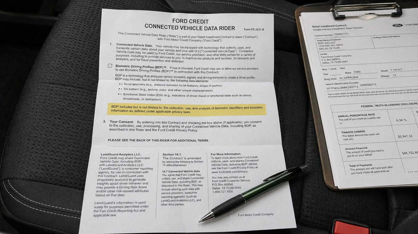 Somewhere between the GAP insurance waiver and the extended warranty decline form, there’s a new page1. Same font, same formatting, same “initial here” line. You sign it the way you sign everything at a dealership — under fluorescent light, slightly numb, a little in shock at the monthly payment, handed a pen before you’ve finished reading. What you’re agreeing to is that your truck will be watching. Face geometry. Iris pattern. Something called an Emotional State Index, which is exactly as disquieting as it sounds. The data goes to the lender. And the insurer. And “applicable state DMV partners,” which is doing a lot of heavy lifting in that sentence.