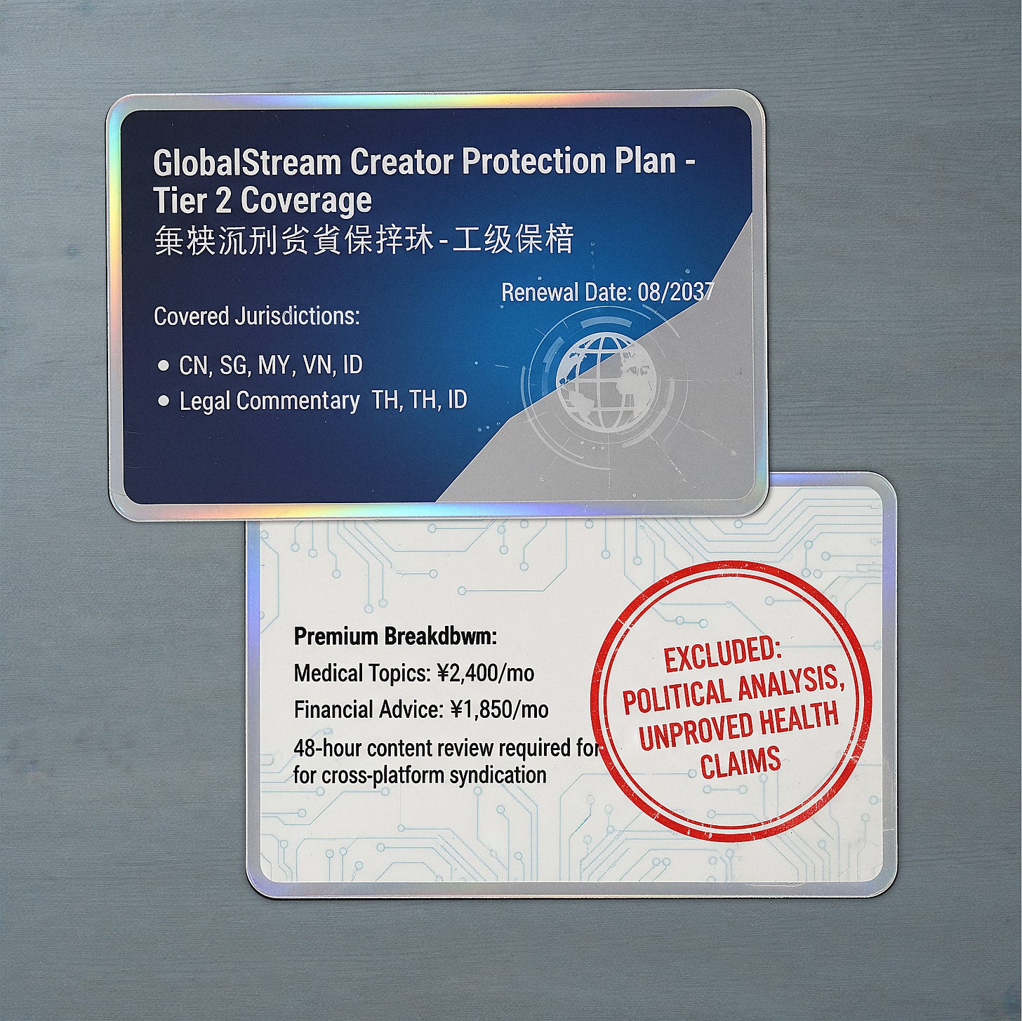But I keep staring at those jurisdiction codes: CN, SG, MY, VN, TH, ID. Six countries where your words need liability coverage before they cross a border. Makes you wonder what the maps look like for everyone who can’t afford Tier 2 protection. Or what happens to all the conversations that used to be free, back when talking was just talking and not a cross-border financial instrument requiring monthly premiums and pre-publication review.