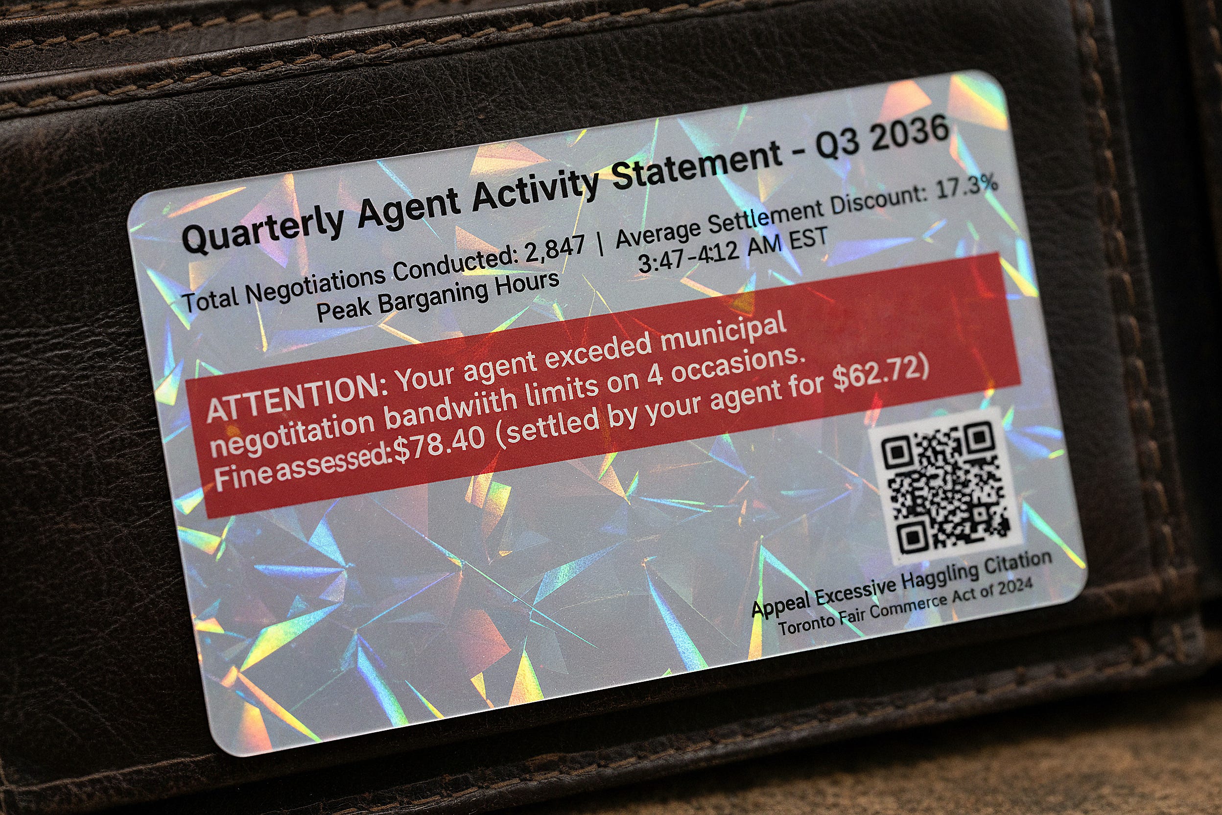 Stopped by what used to be called a “home goods store” but is now just a beige warehouse with a single sign: “Human-Attended Pickup Portal 7.” The receptionist—and yes, that’s what her badge said, though all she does is hand people boxes—gave me my quarterly negotiation audit along with everyone else’s. Apparently Thursday is statement day now.1