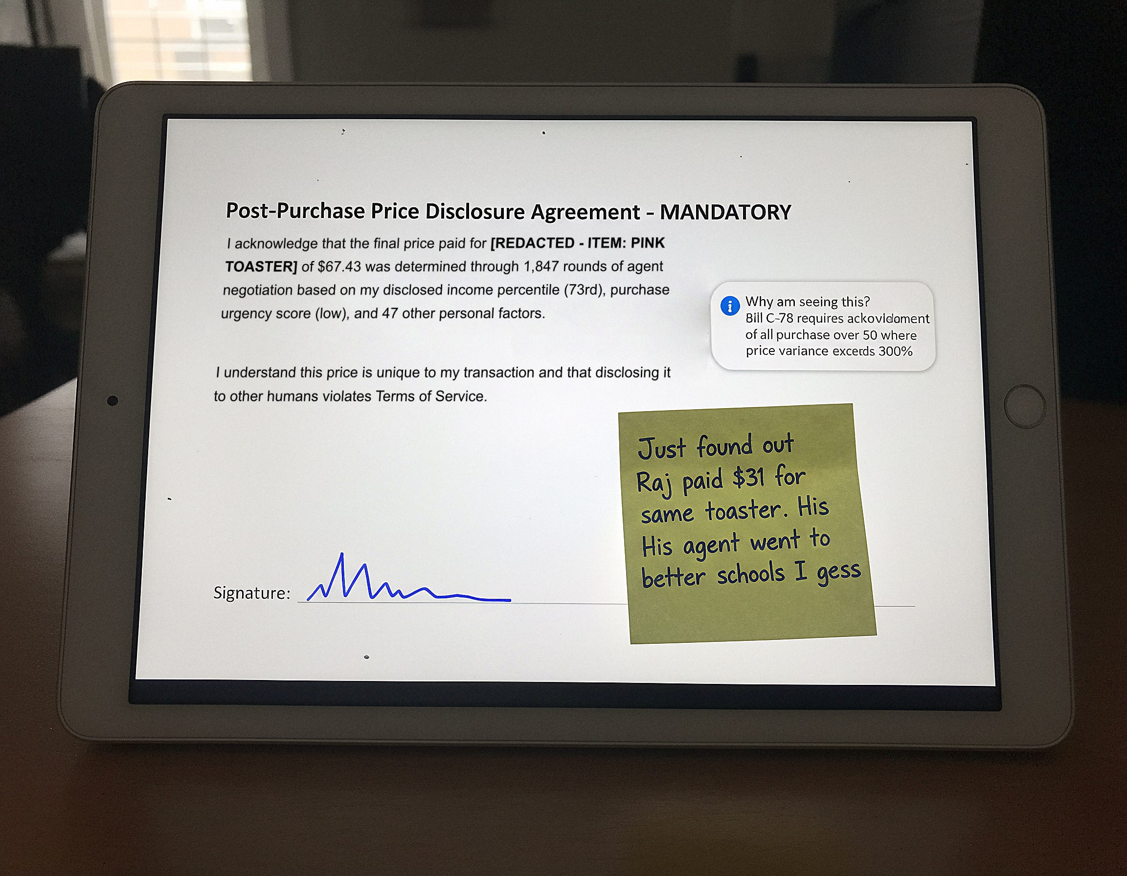 The real kicker? We’ve replaced the tyranny of “one price fits all” with the anxiety of “what did everyone else pay?” Turns out when every purchase is personally negotiated based on 47 factors including your Netflix history and how often you’ve Googled “salary negotiation tips,” the social contract gets weird. Fast. That pricing transparency waiver isn’t just bureaucracy—it’s what keeps dinner parties from devolving into bitter arguments about toaster economics.