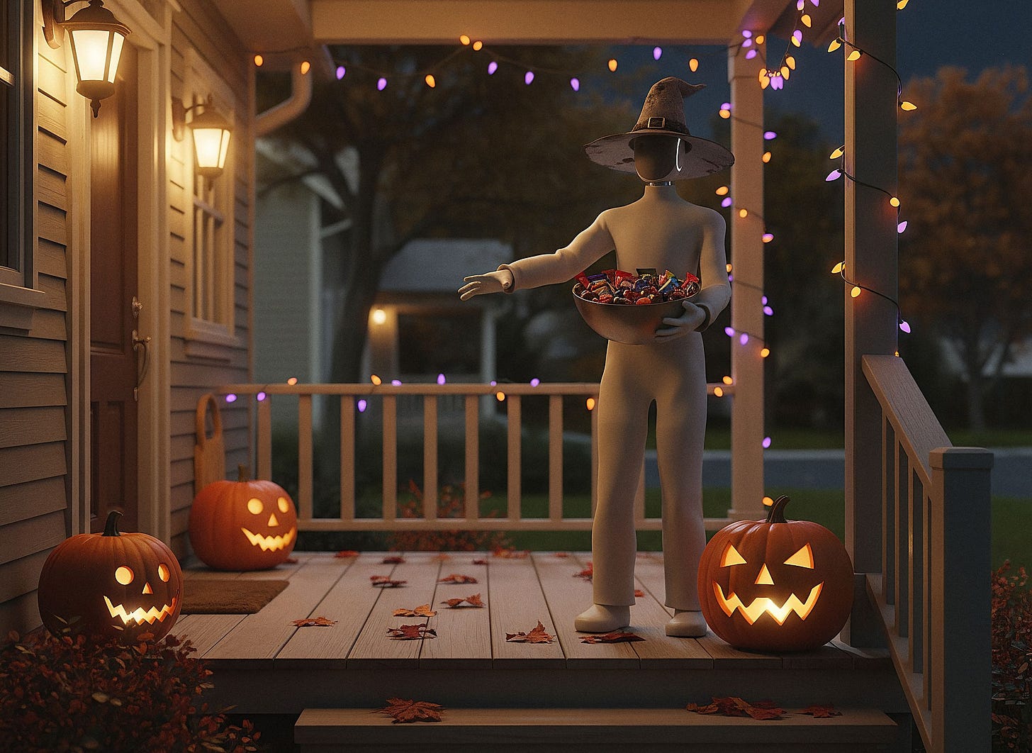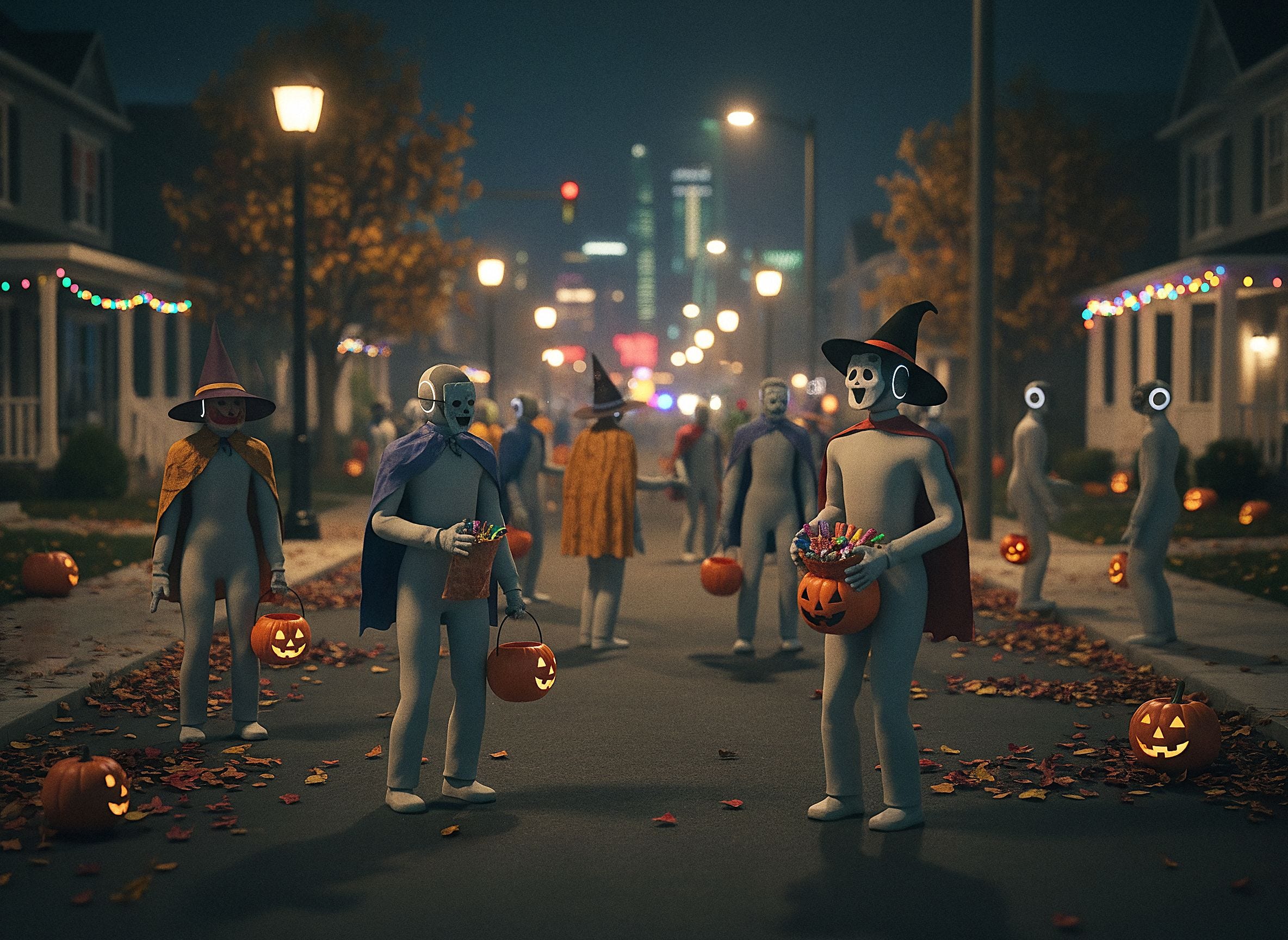 Apparently we’ve reached the point where nobody actually goes trick-or-treating anymore. Not the parents walking their kids around. Not the homeowners answering doors. The robots do both—handing out candy and collecting it, choreographed by teleoperators in call centers halfway around the world who are probably wondering why Americans are so weird about this particular day in October.