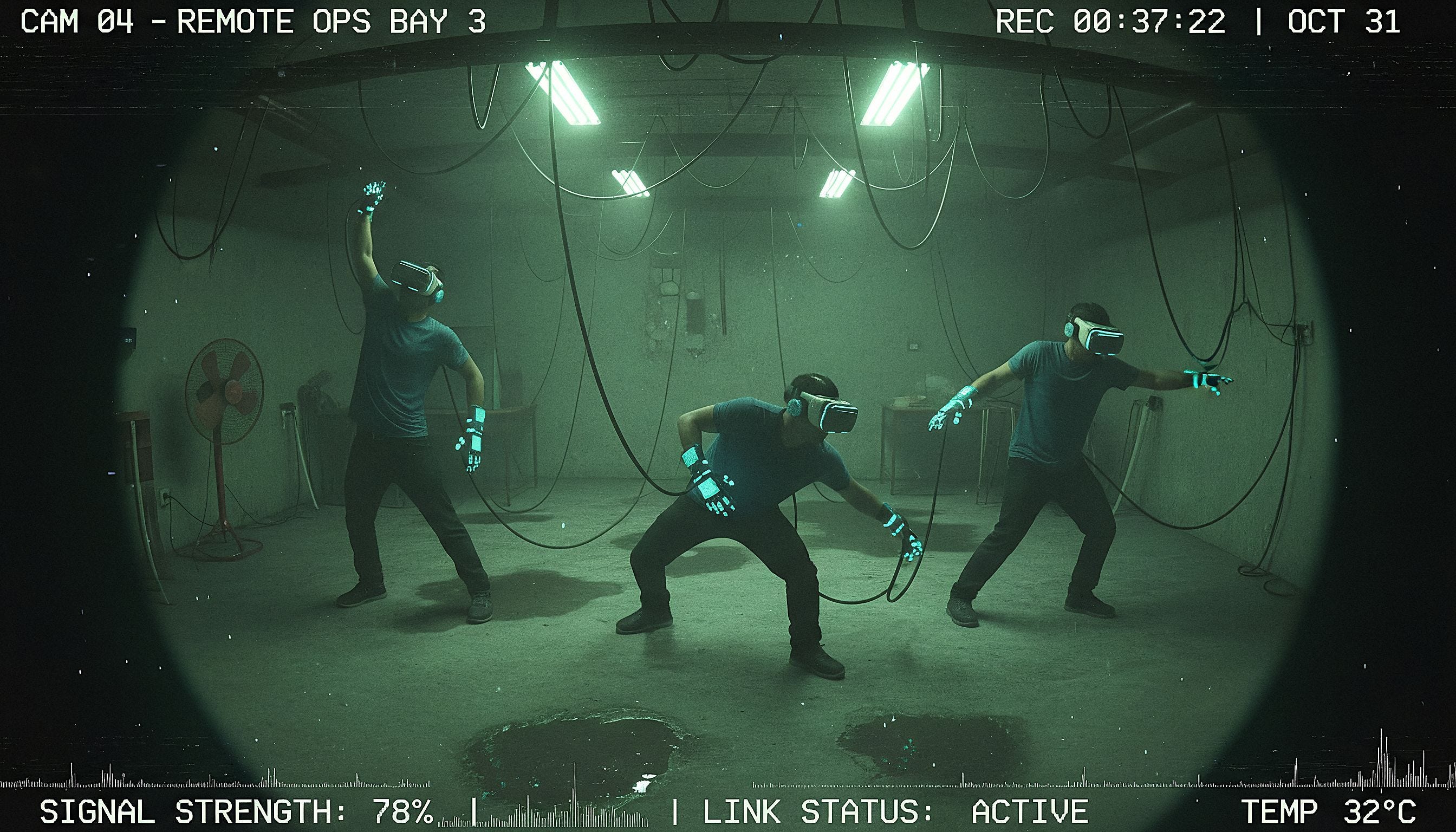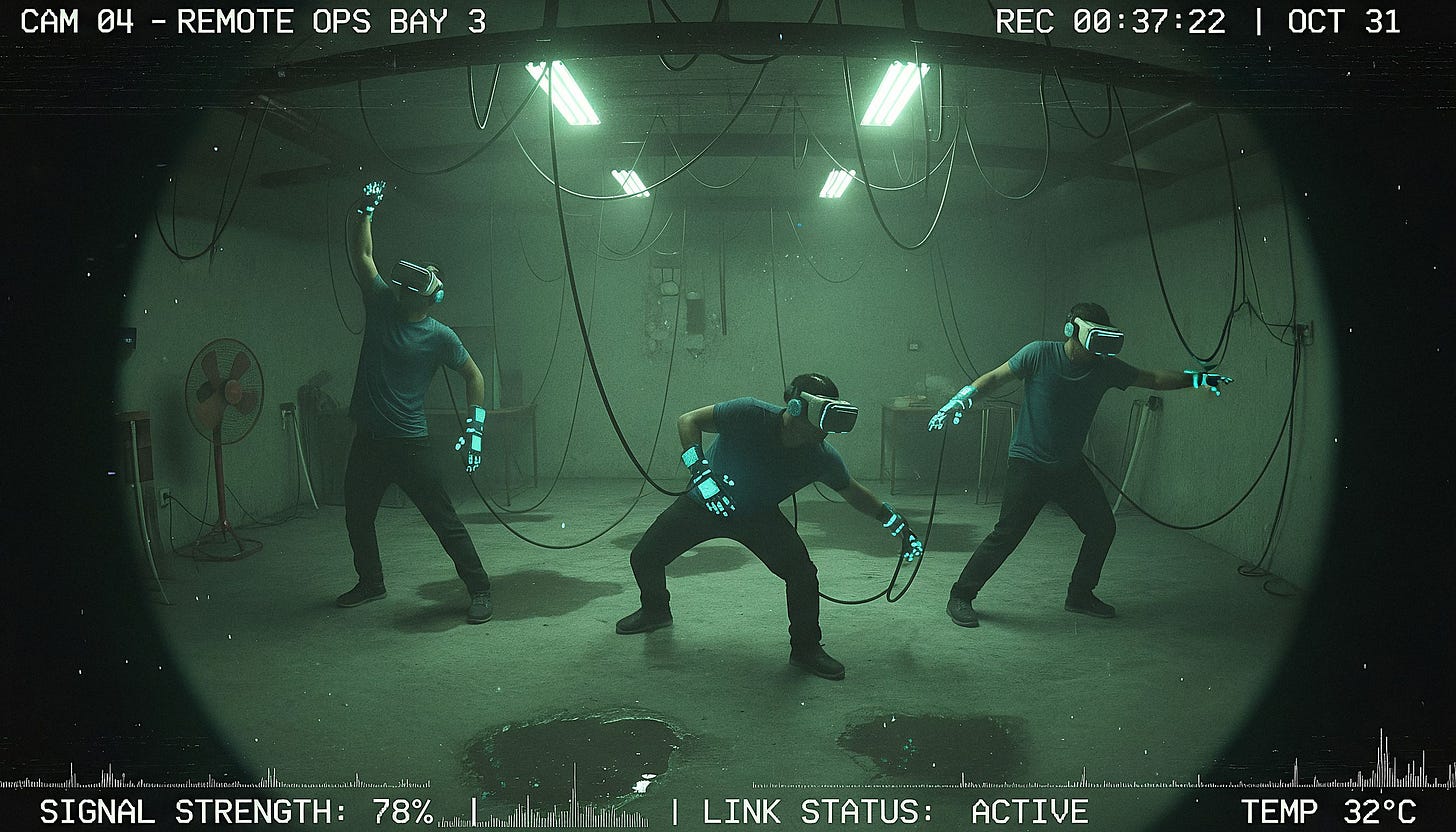 The Janky Time Machine started leaking temporal coolant on someone’s driveway, which seemed appropriate given that I’m watching the past, present, and future of human interaction all collapse into a weird remote-controlled pantomime. A SpookyBot costume unit rolled over to investigate—its operator probably wondering if the mysterious smoking vehicle was part of the holiday decorations.